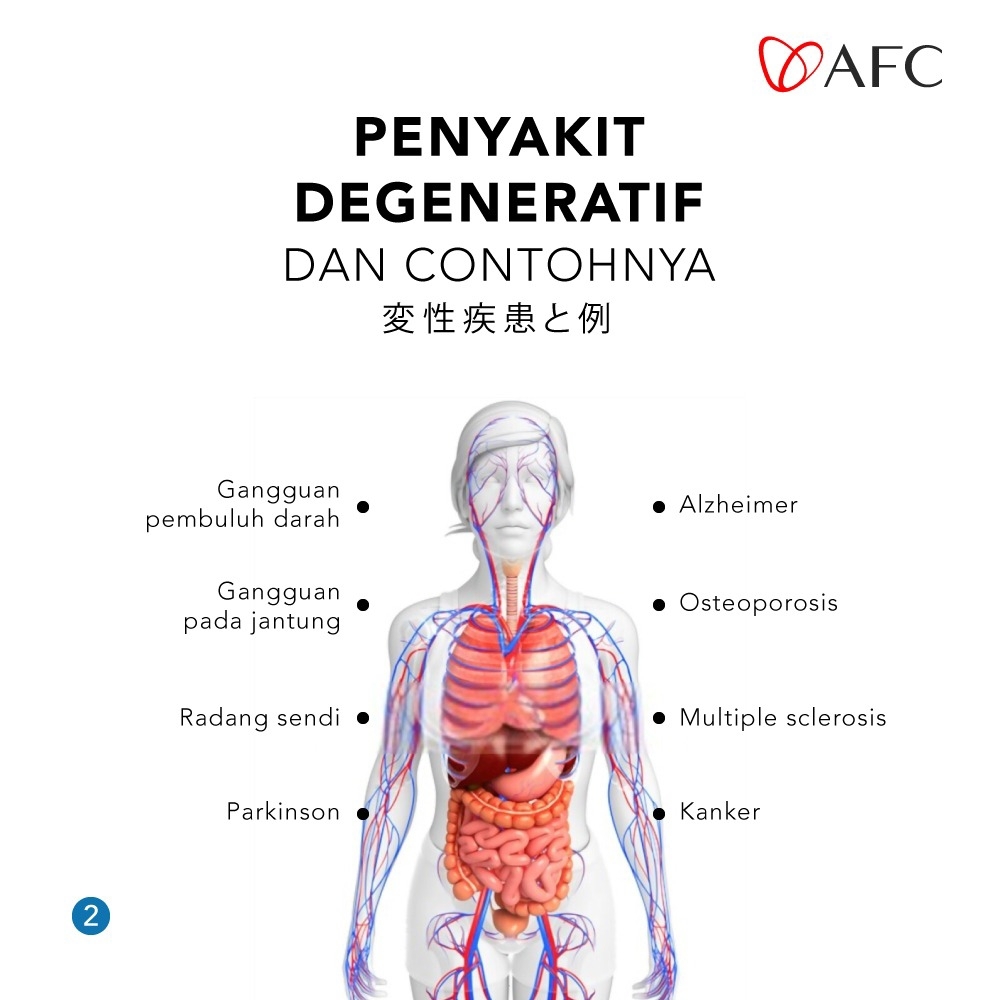 Penyakit degeneratif adalah kondisi kesehatan saat tubuh penderitanya mengalami penurunan fungsi jaringan dan organ. Penyakit degeneratif dapat memburuk seiring berjalannya waktu. Penyakit ini dapat mempengaruhi sistem saraf otak, sumsum tulang belakang, tulang, pembuluh darah, sampai jantung.