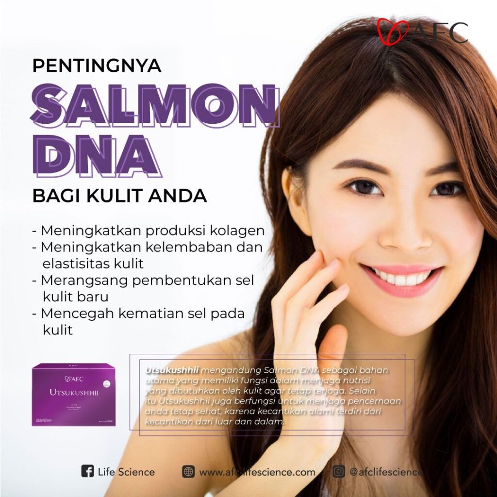Hebatnya lagi, manfaat bagi kulit yang akan Anda peroleh seteah mengkonsumsi Utsukushhii ini boleh dikatakan hampir sama dengan manfaat bagi kulit yang akan Anda dapatkan jika Anda melakukan injeksi/suntik DNA Salmon seperti yang banyak ditawarkan di klinik klinik kecantikan dewasa ini. Karena Utsukushhii sendiri juga mengandung DNA Salmon yang diekstrak dari Salmon Milt (Sperma Ikan Salmon Jantan).