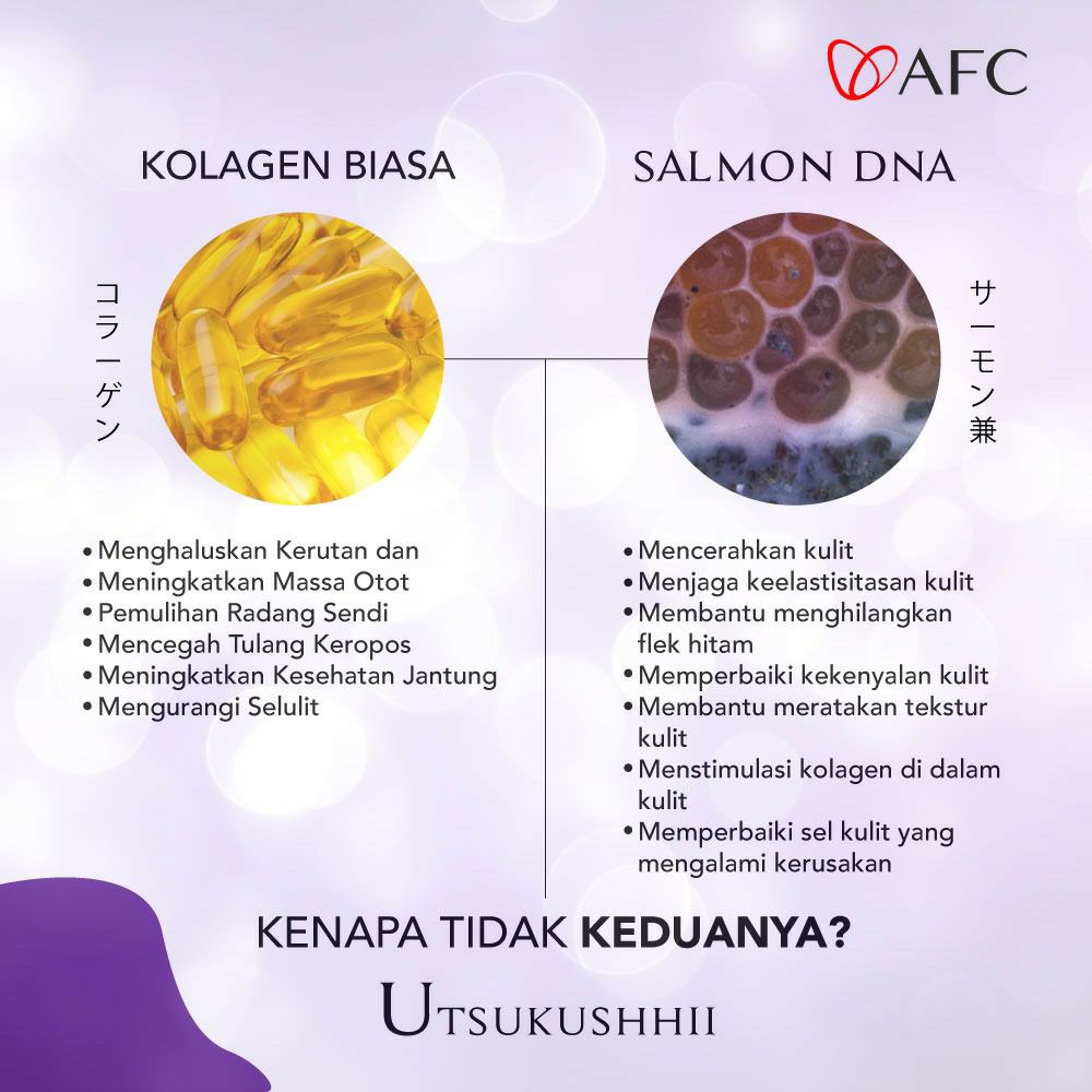 Saat ini, semua bahan bahan alami yang dikonsumsi dan digunakan oleh banyak wanita Jepang telah dikemas semuanya di dalam sebuah produk dari AFC yang bernama Utsukushhii ini sehingga Anda tidak perlu repot lagi untuk menggunakan atau mengkonsumsinya secara terpisah satu per satu. Anda dapat mengkonsumsi Utsukushhii secara rutin jika Anda menginginkan untuk memiliki kulit halus, mulus dan menawan serta kelihatan awet muda seperti gadis Jepang pada umum nya.